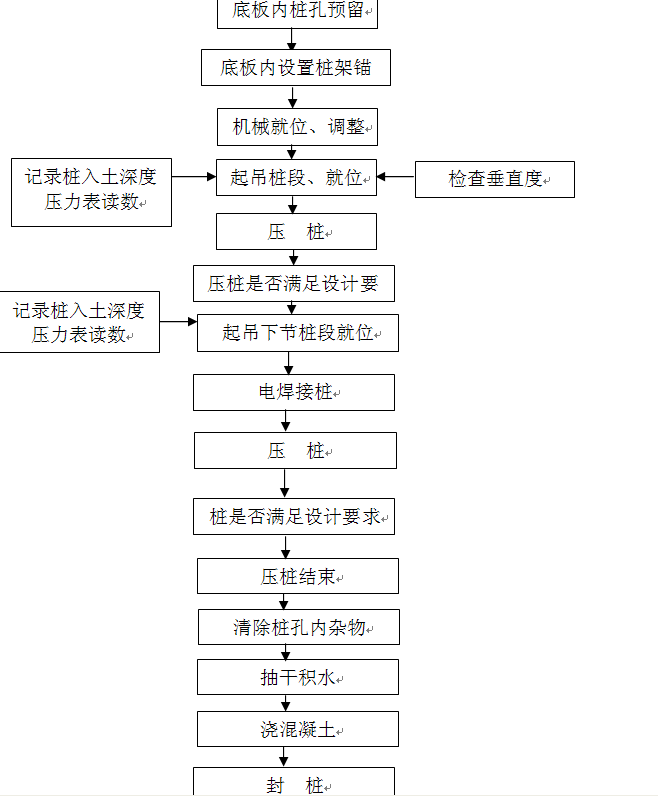 (4)压桩:施工应匀速、连续,每20cm为一次进尺压桩。严格控制压桩垂直度,控制桩的入土深度,正确压至桩的设计标高(以标高控制为依据)。