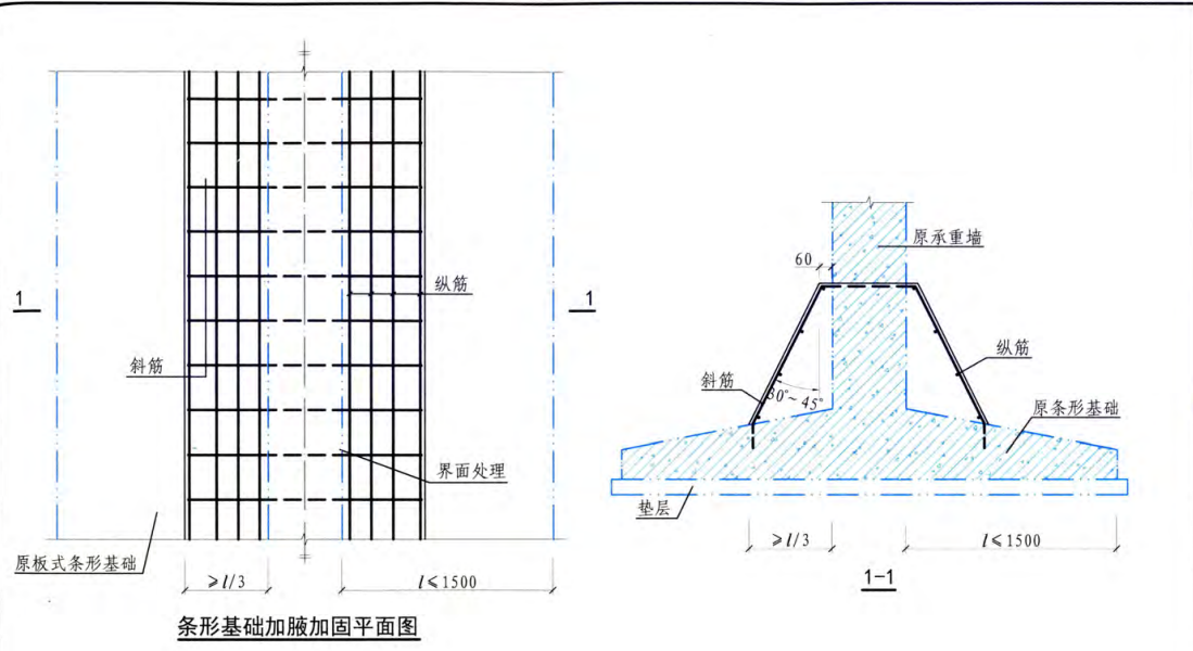 在基础加固中条形基础加固是一种常用的提高主题结构承载力的加固办法之一,通过条形基础加腋加固的做法可以更好的对基础进行加固处理