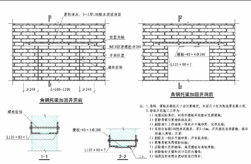 在日常装修中经常遇到墙体开门开窗,这样破坏的结构的安全性,必须要对洞口进行加固处理,加固的方式有很多,今天主要介绍的的角钢加固,角钢是加固中常用到的加固材料,使用角钢加固可以提高结构的承载力,下面分享一个托通过角钢托梁加固方的施工方法
