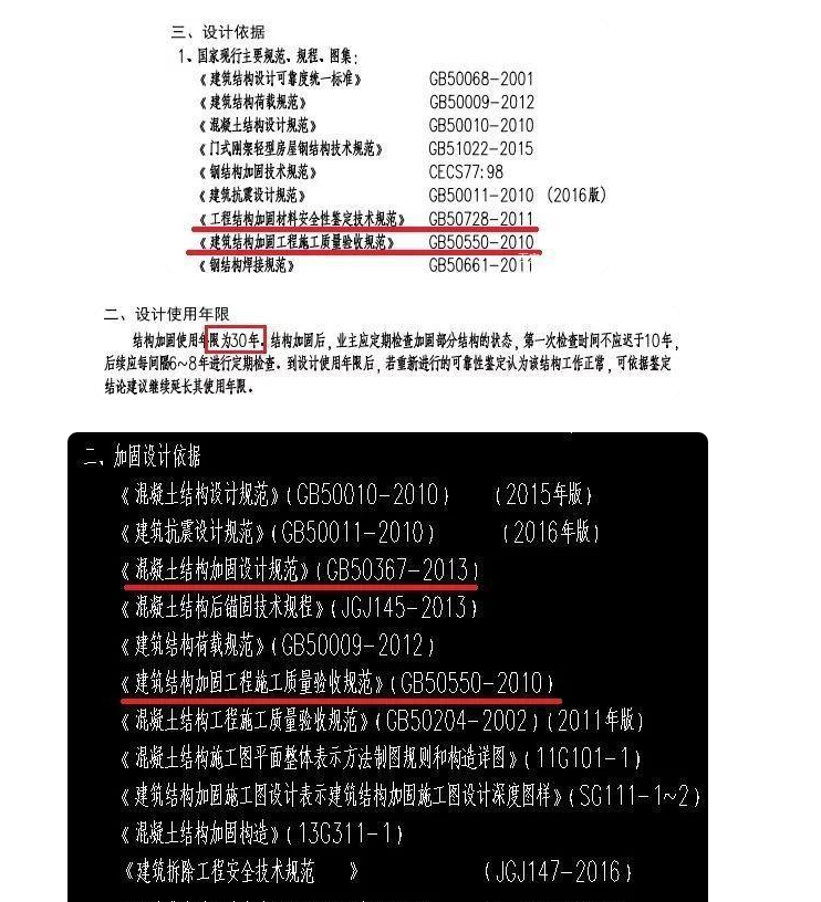 重点看主要的材料要求和施工要求,包括材料类别、使用场景、满足什么规范强条要求等。 例如上图说明结构加固使用年限30年那么选用的加固材料列如结构胶安装规范要求必须提供30年的抗老化报告